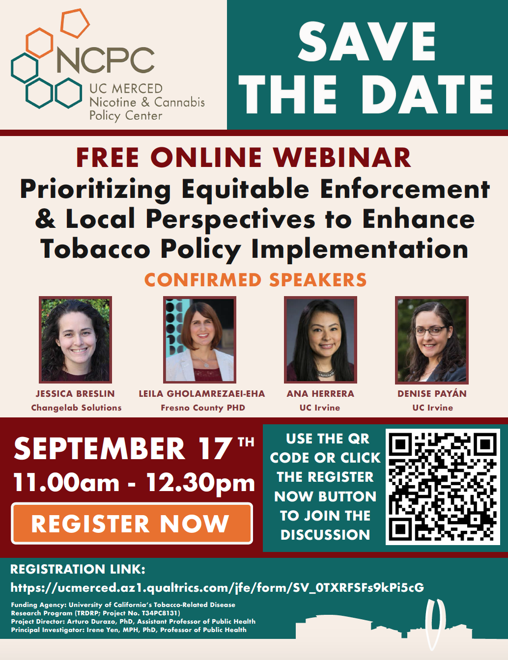 The Nicotine and Cannabis Policy Center, hosted another free online webinar on Wednesday, September 17th 2025. This policy webinar focuses on the equitable enforcement of California’s emerging tobacco control policies. This presentation provides insights from experts and practitioners working at the intersection of law, public health, and community engagement, emphasizing the implementation and enforcement such as Tobacco Retail Licensing (TRL) policies.